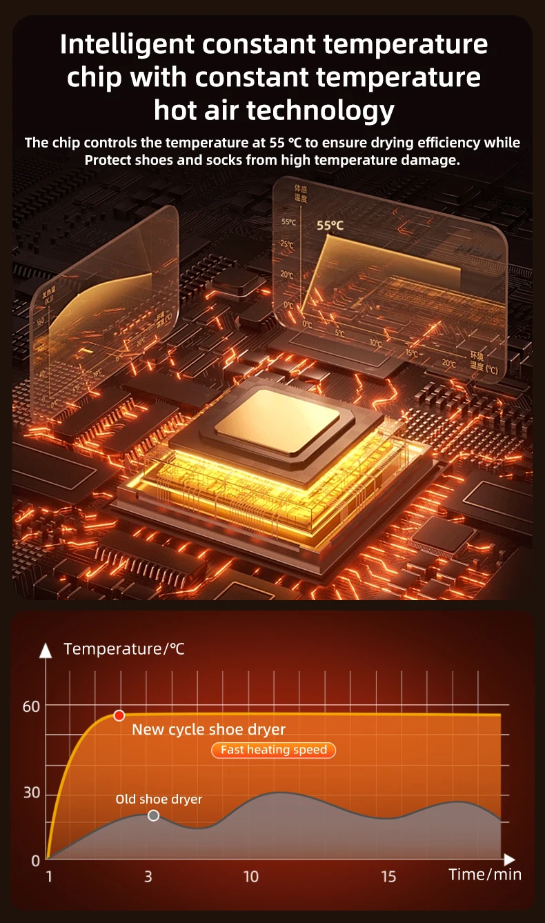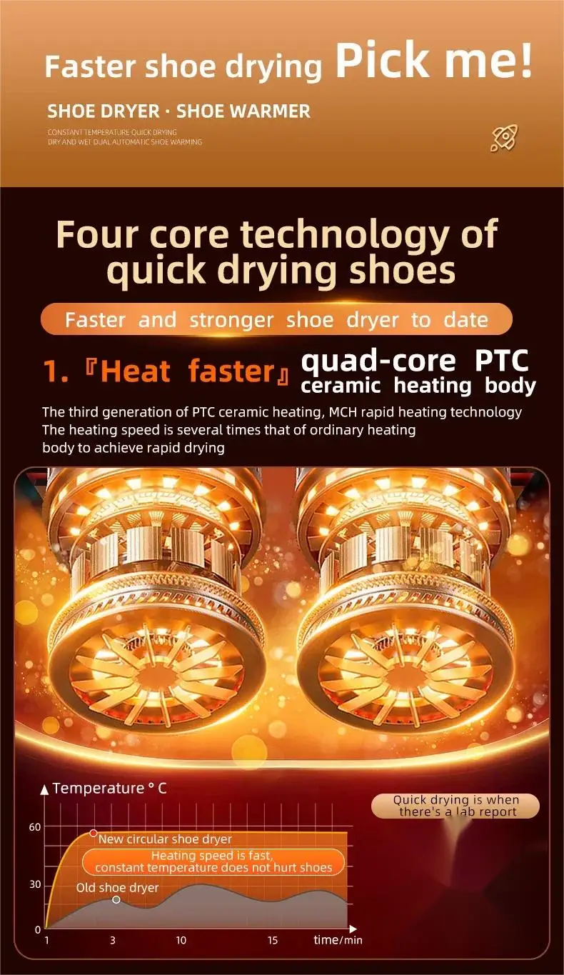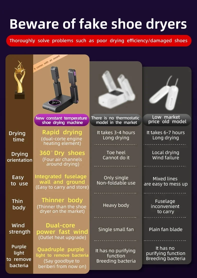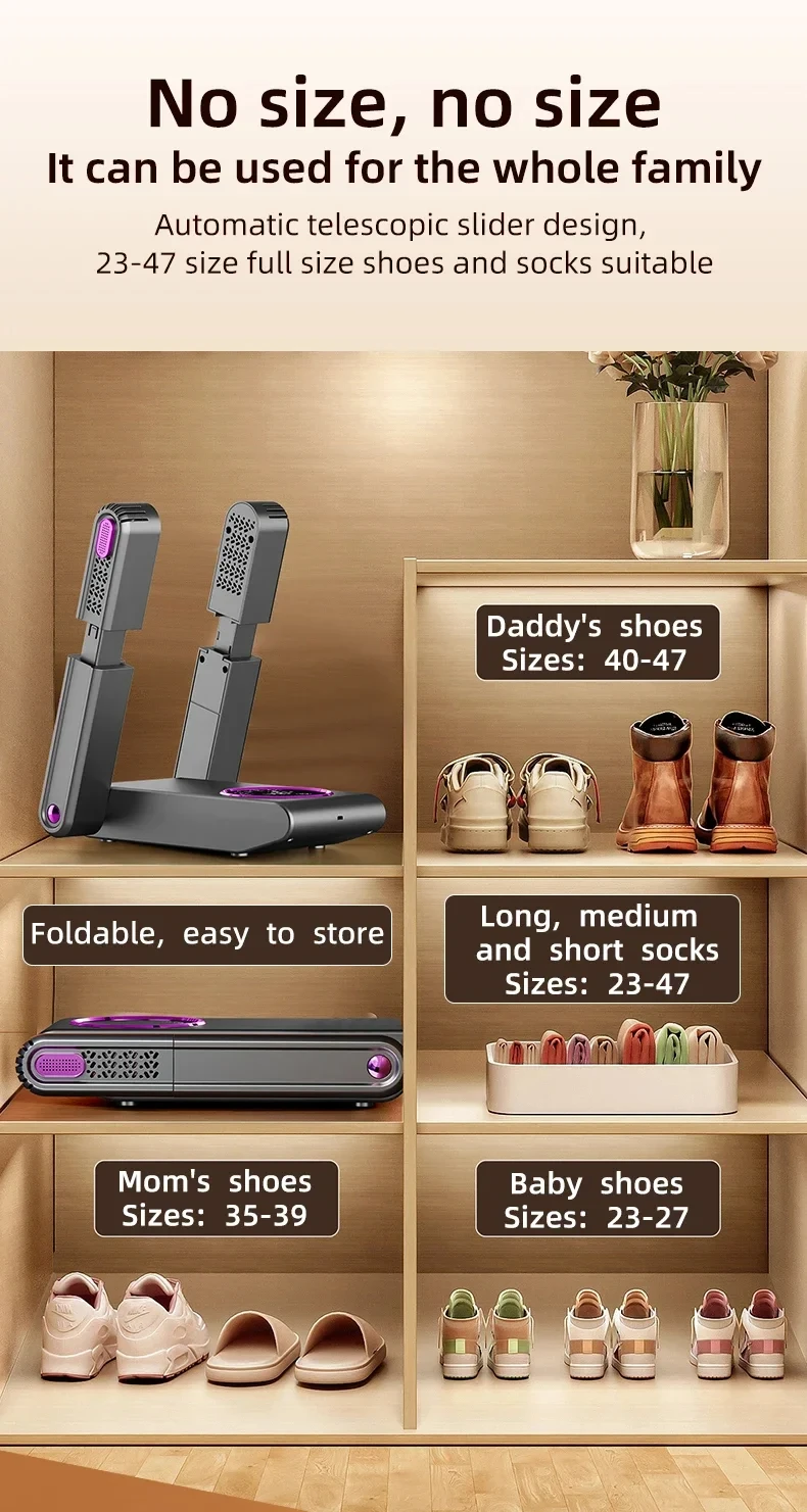 Este secador de sapatos foi projetado para secar seus sapatos de forma rápida e eficiente, economizando tempo e esforço.