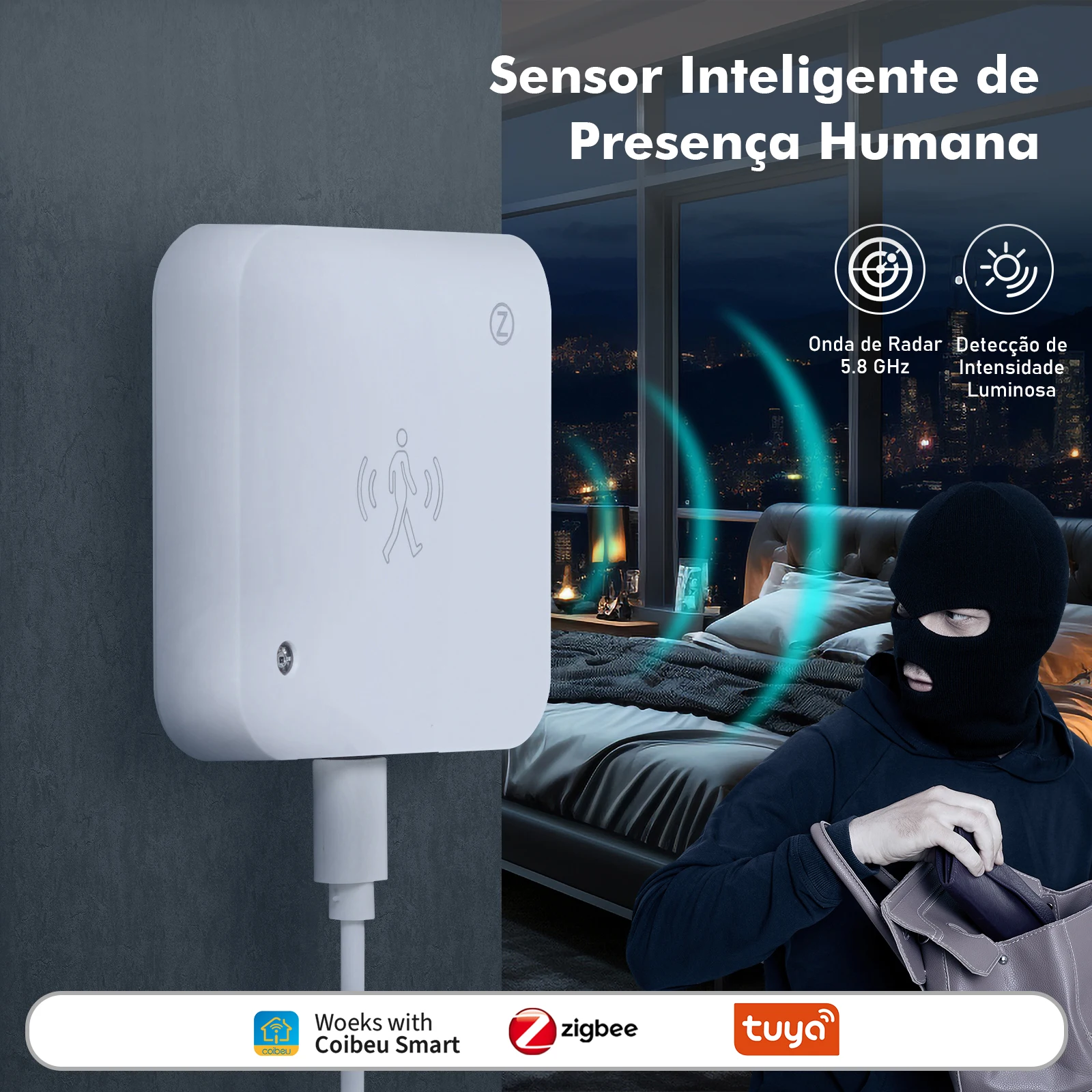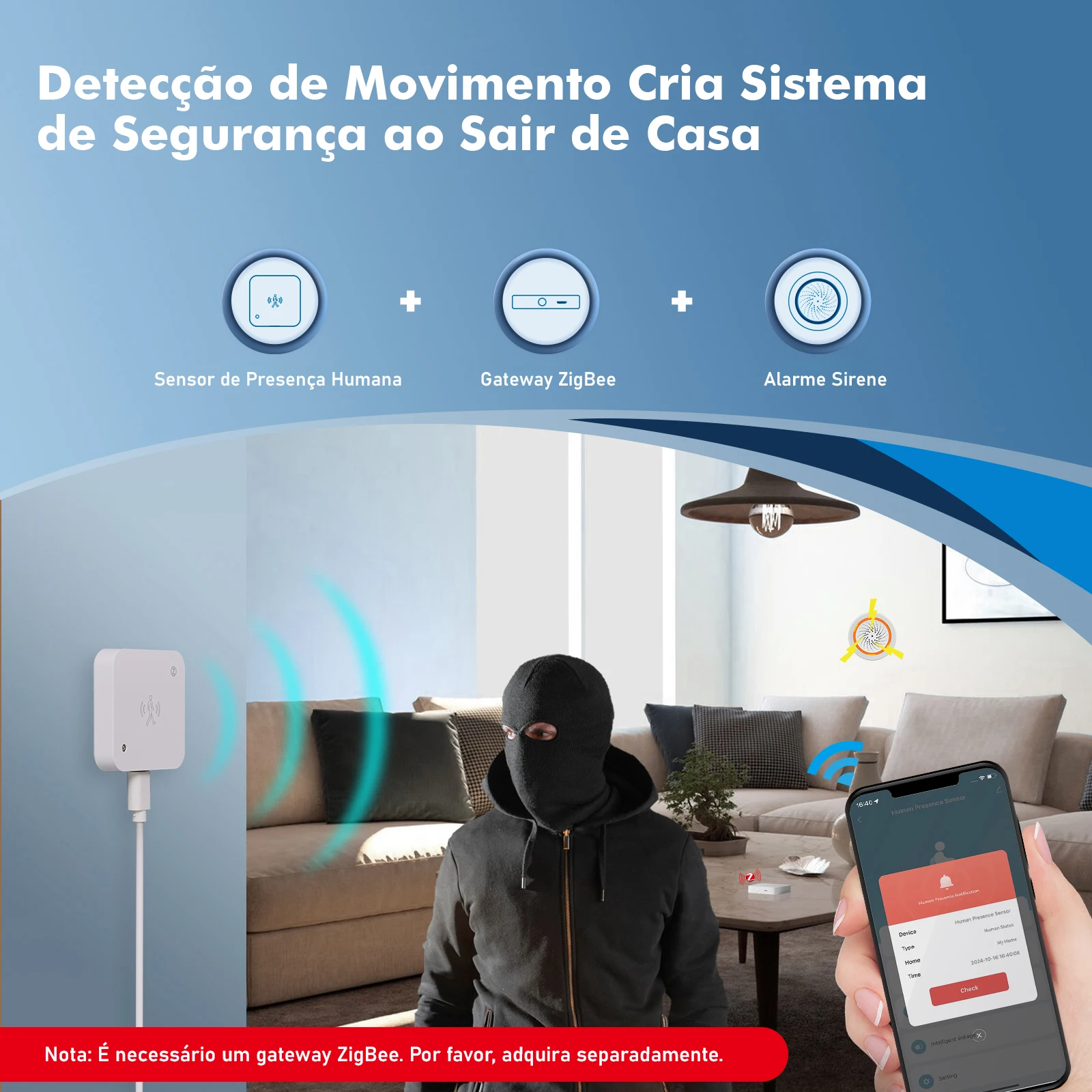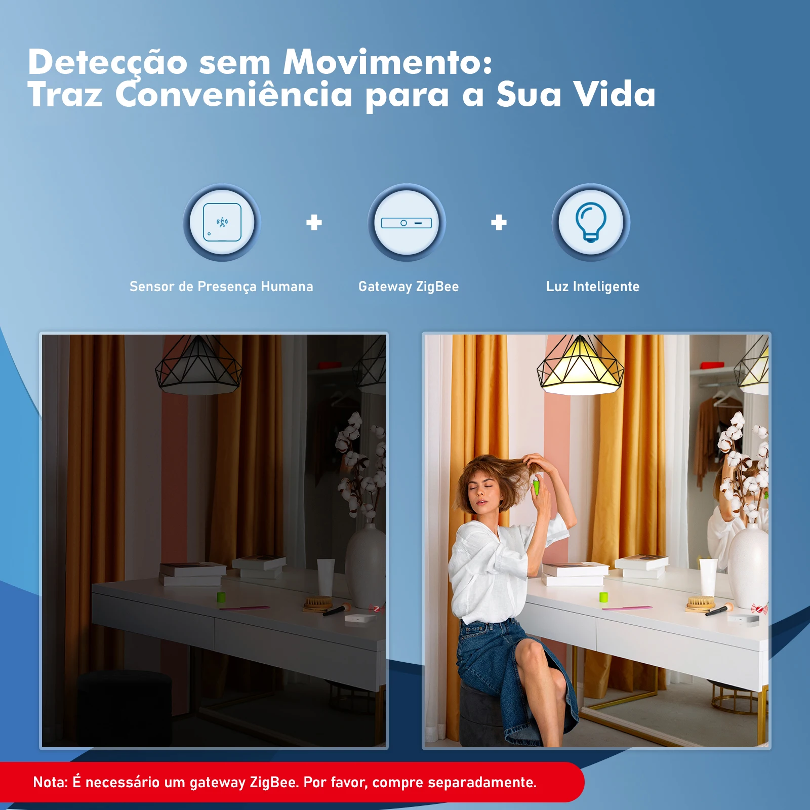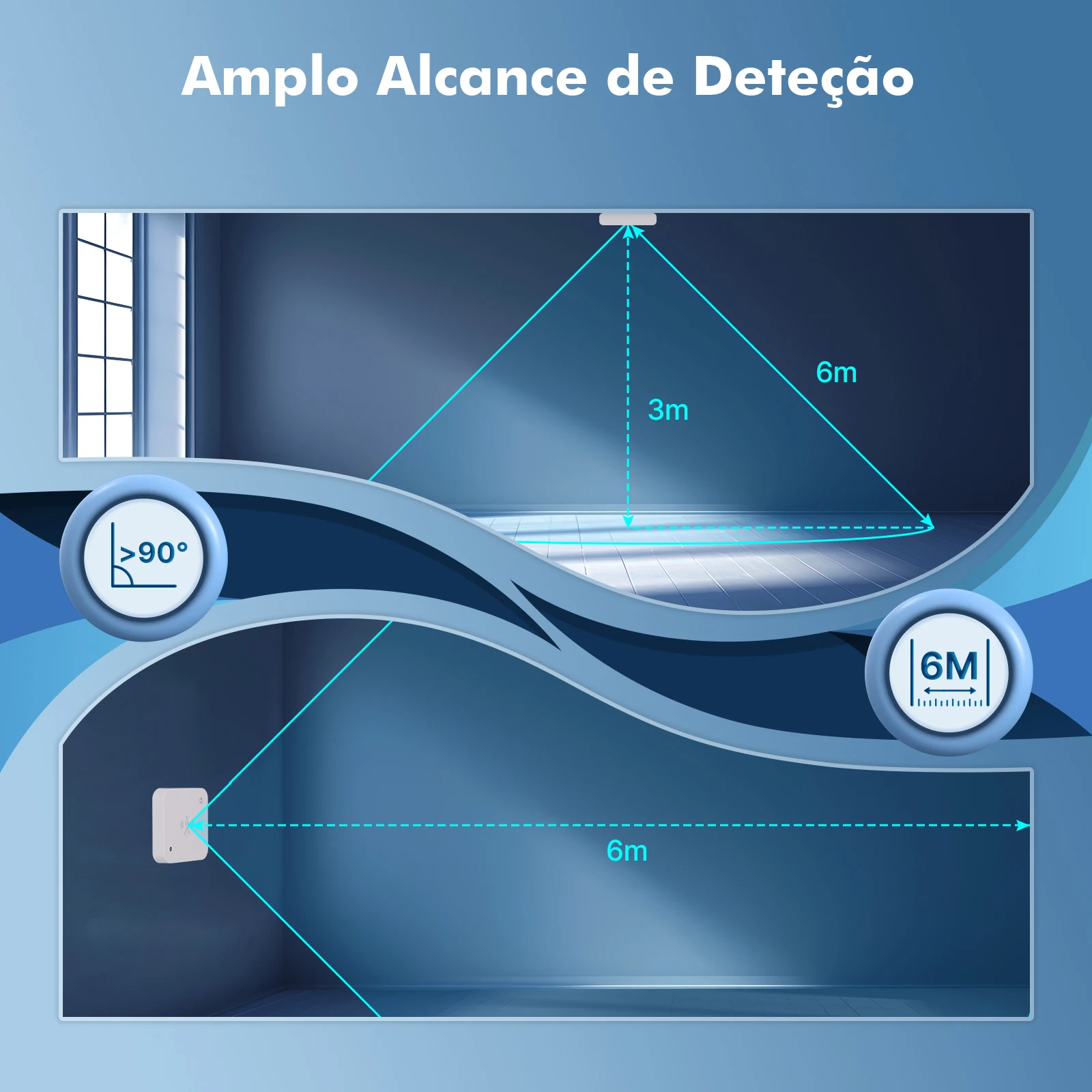 Detecta tanto movimento quanto permanência imóvel de pessoas, com alcance de até 6 metros e ângulo superior a 90°, ideal para ambientes domésticos e comerciais.